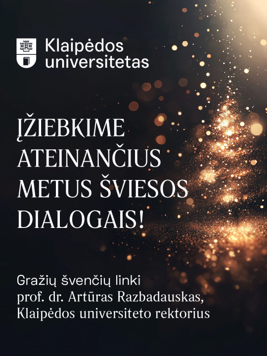 2025-ieji Klaipėdos universitete paženklinti šviesos dialogu – su savimi, su bendruomene, su ateitimi. Šiemet dalijomės ne tik žiniomis, bet ir pasitikėjimu. Kartu įveikėme iššūkius, augome, kūrėme – kartais matomai, kartais tyliai, bet visada kryptingai. 2025-aisiais Klaipėdos universitetas tapo dar atviresnis miestui, drąsesnis moksle, labiau matomas tarptautinėje erdvėje. Ir visa tai – Jūsų dėka. KU bendruomene, miestiečiai, partneriai – šviesos Jūsų šventėms, prasmės ateinantiems metams! Susitikime 2026-aisiais – naujam šviesos dialogui. Prof. dr. Artūras Razbadauskas, Klaipėdos universiteto rektorius