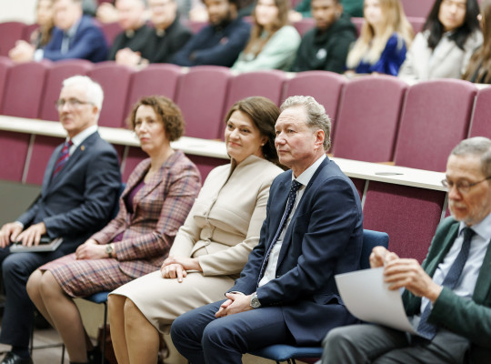 Pirmoji ponia Klaipėdos universitete sveikina mokslinės-praktinės konferencijos „Į sveiką gyvenseną ir skaidrią būtį Vydūno keliu“ dalyvius