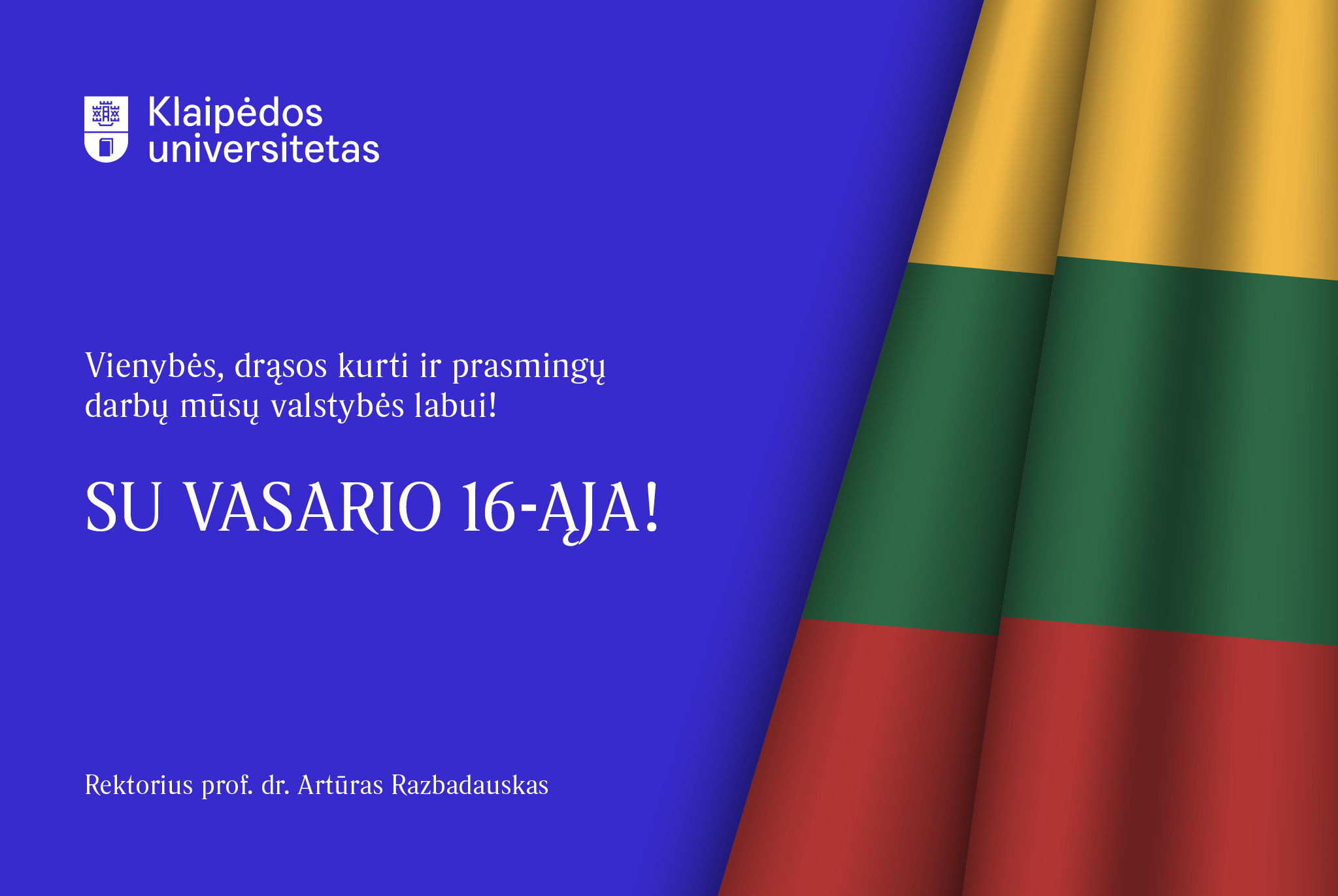 Tegul ši diena įkvepia didžiuotis Lietuva, puoselėti mokslo, žinių ir pilietiškumo vertybes, drąsiai kurti ir prisidėti prie šalies ateities. Universitetas yra vieta, kur gimsta idėjos, stiprėja bendruomenė ir auga atsakingi žmonės – būtent tokios Lietuvos šiandien ir rytoj labiausiai reikia.